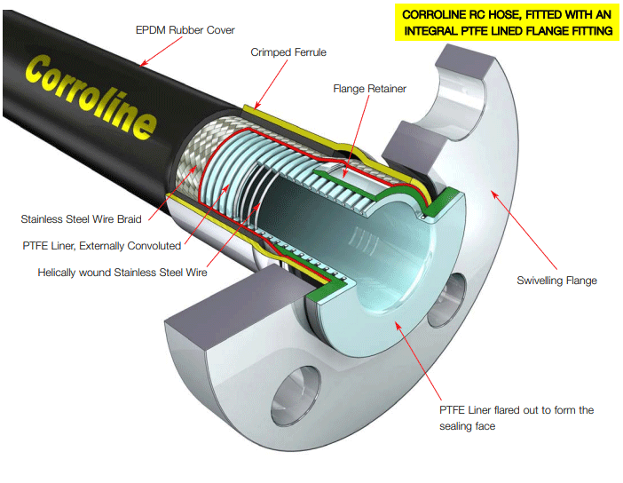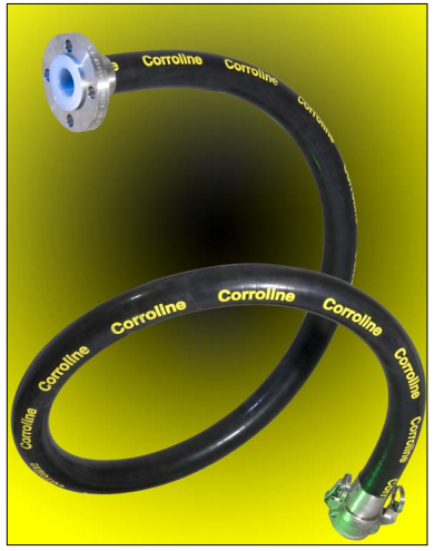 ![]() Corroline hose was designed and developed to provide customers with a universal chemical hose product which combined all the requirements they had requested for chemical plant applications, particularly the need for improved flexibility. Corroline hose not only supersedes but also improves upon the wide variety of alternative Chemical Hose products currently available. CONSTRUCTION Corroline is built around a patented PTFE hose liner design, which has a slightly rippled smooth bore inside, but convoluted outside to generate excellent flexibility combined with “hoop strength”. A stainless helical wire is wound in to the external convolutions, which adds to the kink resistance, crush resistance and the resistance of the hose to both pressure and vacuum. This reinforced PTFE Liner construction is strong enough to withstand full vacuum and kinking without the need for either internal convolutions or the need to bond the liner to an outer cover, making it an ideal hose liner design, and a significant improvement upon standard products currently available. The PTFE liner is then further reinforced with an outer braid, either a Stainless Steel wire braid (SS Grade) or a Polypropylene braid (PB Grade) to provide two braided hose grades. The most popular grade (RC Grade) includes an outer cover of abrasion resistant, black antistatic EPDM rubber which is extruded on to a SS braided liner, with a super-smooth surface finish to aid external cleaning. A yellow, “CORROLINE” stripe is printed on to the cover. Other texts and colored stripes are also available to special order. Pressure and Temperature LimitationsMaximum Working Pressures – Burst Pressures – Vacuum LimitationsUsable at vacuum to -0.9bar up to 150˚C/302˚F. FlexibilityMuch less force to bend than any other smooth bore PTFE lined hose product. Kink ResistanceMuch more resistant to kinking than any other smooth bore PTFE lined hose product, and much more kink resistant than the previous Corroline product. Fire resistanceCorroline+ hose is Fireproof to BS5173 Section 103.13 Parts 6.2 and 6.3, and Corroline+ hose assemblies can be upgraded to Fireproof by applying DBK 300 at each end. All assemblies comply with the flammability requirement as set out in EN 16643. ‘Rolling U’ Flex Life TestMore than 100 × the flex life to failure compared with all other types of smooth bore PTFE, FEP and PFA lined rubber covered hose products. Flow ratesMore than 2 times the flow rates for convoluted bore hose designs. Consult Aflex Hose for specific flow rate information. Gas permeabilityReduced gas permeability compared with other PTFE lined hose designs, due to the heavy compression applied to the PTFE during processing, which reduces porosity. |