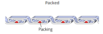 Interlocked metal hose, by the nature of its construction, is not pressure tight. However, pressure and media infiltration through the interlocked wall can be minimized by the insertion of one of a variety of packings into the wall during hose manufacturing. Packing consists of a continuous cord or strand of elastomer, or other material which is locked into a special channel between the interlocked hose wall layers. The choice of packing material is tailored to the demands of the specific application.